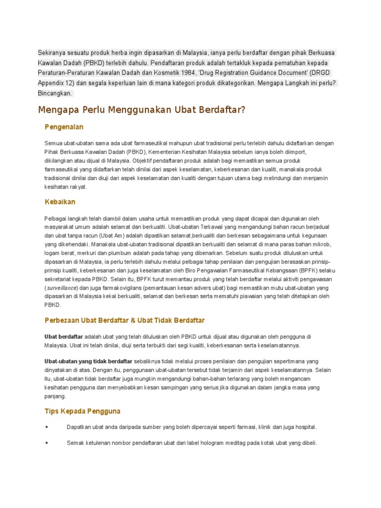 Related : Pihak Berkuasa Kawalan Dadah - Semua produk farmaseutikal termasuklah suplemen kesihatan dan persediaan tradisional perlu berdaftar dengan pihak berkuasa kawalan dadah (pbkd) sebelum dipasarkan di malaysia..